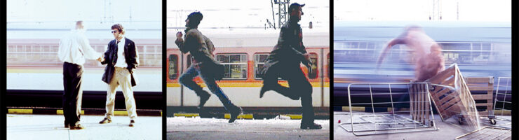 Eine S-Bahn-Fahrt vom Hauptbahnhof Richtung Pasing. Der Zug beschleunigt hinter der Hackerbrücke. Rechts am Fenster flache Hallen. Zwei Männer davor auf einer Rampe.