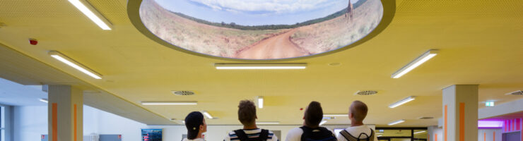 Im Zugangsbereich des Schulzentrums steht eine Gangway, Höhe 4,50m. Der silberne Glanz und die goldene Zeichnung der Treppe lassen sie als ein mysteriöses Artefakt erscheinen.